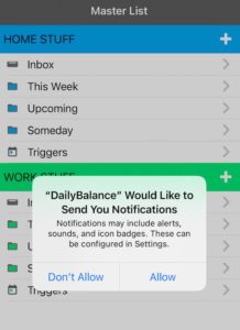 If you mistakenly say Don’t Allow, you can change this by going to the Settings app on the phone, scrolling down to DailyBalance and turning Notifications on (green).